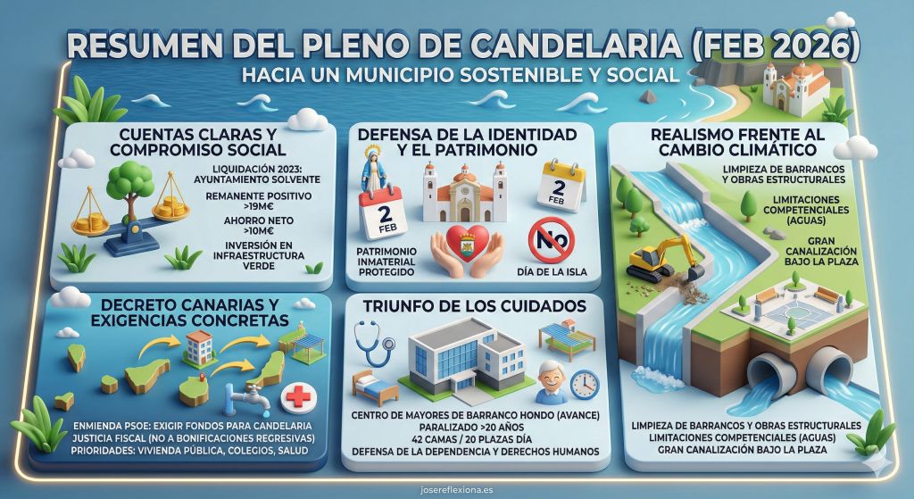 Hoy nos adentramos en el pulso político local. Ese espacio vital donde las grandes políticas globales —como la necesaria transición ecológica, el escudo social o la defensa de los servicios públicos— aterrizan. Tomando forma en el día a día de la ciudadanía. En esta ocasión, he analizado con detenimiento el Pleno Ordinario del Ayuntamiento de Candelaria del 27 de febrero de 2026. Una sesión que nos ha dejado ver el esfuerzo de un gobierno municipal por sacar adelante proyectos transformadores. En frente las trabas burocráticas y la demagogia política.
